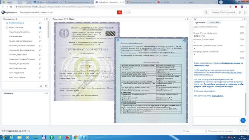 С целью повышения уровня знаний персонала районных отделов, особенно лаборантов, анализирующих семена, филиал по Республике Татарстан начиная со 2 октября т.г. проводит в часовом режиме еженедельные внутренние видеоконференции (вебинары) по вопросам, связанные с нормативной документацией в сфере семеноводства, федеральные, а так же региональные приказы, правила заполнения и выдачи сертификатов, исполнение вопросов региональной политики в сфере семеноводства и др.