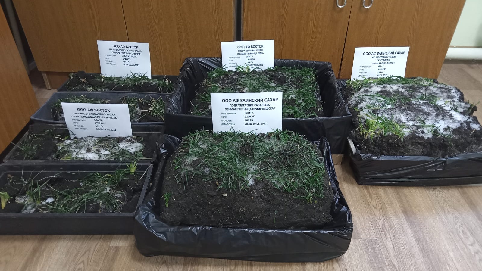 В производственном кооперативе «Савалеево» ООО «Агрофирма “Заинский сахар”» отобраны монолиты озимой пшеницы с площади 261 га, сорт Прииртышский, элита, предшественник – сидеральный пар, сев проведен 28–29 августа 2021 года. Растения озимой пшеницы ушли в зимовку в фазе кущения. Высота снежного покрова 8–10 см. Температура почвы на глубине узла кущения -6,3 ºС. Ледяной корки нет. Также отобраны монолиты озимой пшеницы с площади 72 га, сорт Умка, элита, предшественник – сидеральный пар, сев проведен 20 августа 2021 года. Растения озимой пшеницы ушли в зимовку в фазе кущения. Высота снежного покрова 10–20 см. Температура почвы на глубине узла кущения -5,6 ºС. Ледяная корка 0,1 см.